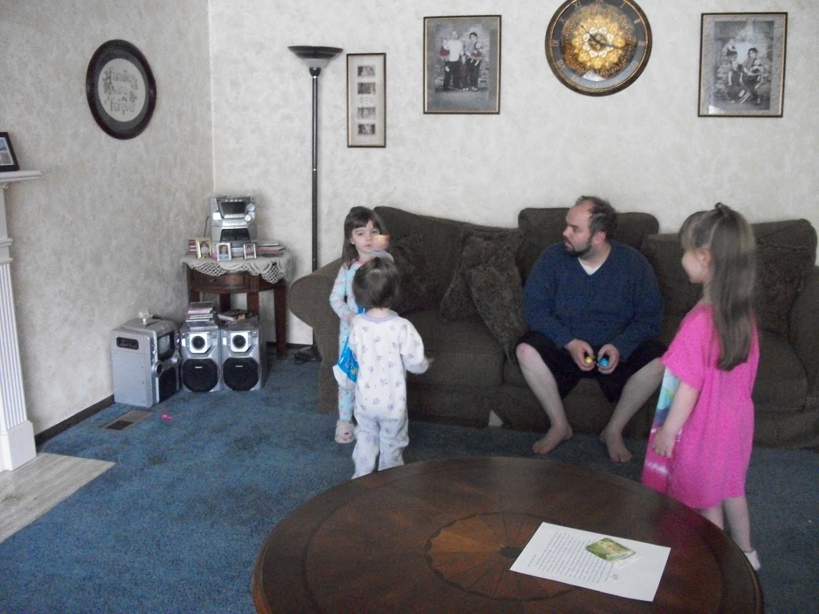 Ok, this year we had a really fun Easter. I think that Holidays with kids make all the difference. We started early on Saturday going to Dimple Dell for an Easter Egg Dive at the pool where the girls take swimming lessons. That was very fun. Each age group would have 15 minutes to get as many eggs as they could, then you would trade the eggs for a big bag of candy and other stuff (silly bands, stickers, tattoos, etc). Dane had to work that day so my brother Daniel came with me since they were separated by ages, but I had to be in the water with them. We went home after and got ready for Grandfather's birthday but we couldn't be at the luncheon since Dane had to work until 1:00pm and he got back home at 2:00pm. We went to the Tree House and Dane was able to spend some time with cousins and siblings playing wallyball and basketball while Leah, Bella and Giada ran all over the place. After that we took the girls to the park because they were so sad to miss going back to Pam's house (we went on Friday night and they loved it there and when we left we told them it was Ok because we were going to go back the next day), then we went to chuck-a-Rama and then we went back home to paint the eggs for the Easter Bunny. On Sunday morning the girls woke up and went egg hunting and they were having so much fun. With the eggs they found presents from the Easter Bunny and a very unexpected letter: I think you all have heard about Leah's school project about Larry the Leprechaun. Well, Leah has been so excited about this project, so much so, that she made a "trap" for Larry with a jewerly box full of green things that he was going to be unable to resist, and once he got in the jewerly box to look at the things he would be trapped inside of it. The letter was from the Easter Bunny telling her that sometimes he likes to bring some friends along to hide the eggs and this year he had Larry the Leprechaun with him. He said that Larry wasn't very good at hiding eggs and that when he was done hiding them Larry was nowhere to be found. He said he had to go looking for him all over the house and finally found him in Leah's room inside of a box and that he had to help him get out of there. He said that Larry told him that he found that box full of wonderful things that he wanted to take with him (among others were a green sock and a tinkerbell Valentine's card) and the Easter Bunny told him he could take the sock but that he had to leave the card since it was from one of Leah's friends from school. I wish you could have seen Leah's face while Dane was reading the letter to her. Also, she had left a little chocolate bunny for the Easter Bunny and she was very happy to see that he had nibbled on it, and she took the letter, with the postcards we received last week and the nibbled on chocolate bunny to show in her school today. The girls spent the rest of the afternoon watching the movies the Easter Bunny got for them and eating their chocolate bunnies and candy. All in all a wonderful weekend, and for the girls a very magical one :) Happy Easter everyone!